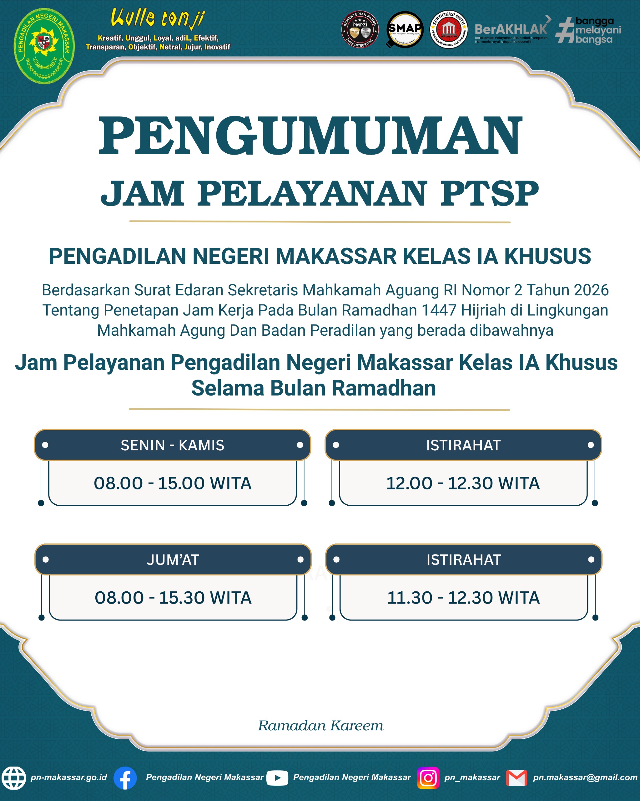 Keluarga Besar Pengadilan Negeri Makassar Kelas IA Khusus Mengucapkan, Selamat Menunaikan Ibadah Puasa 1447 Hijriah