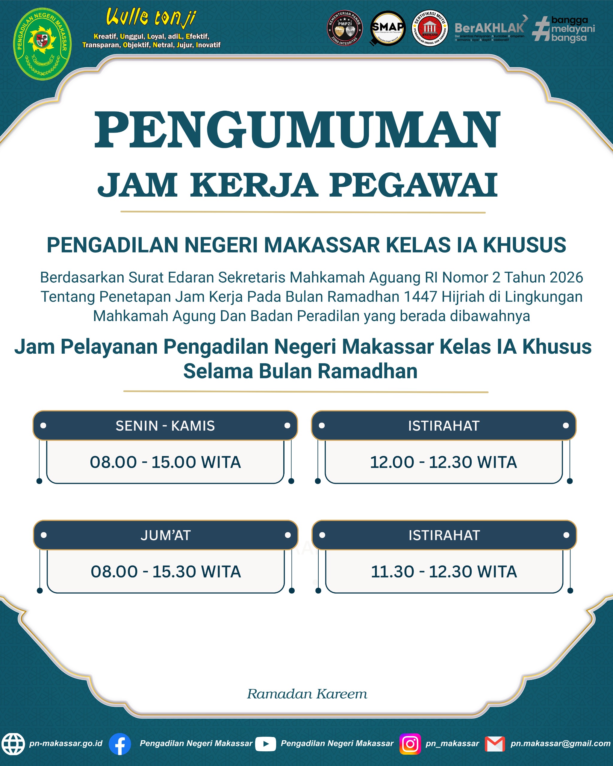 PENGUMUMAN JAM KERJA PEGAWAI SELAMA BULAN RAMADHAN