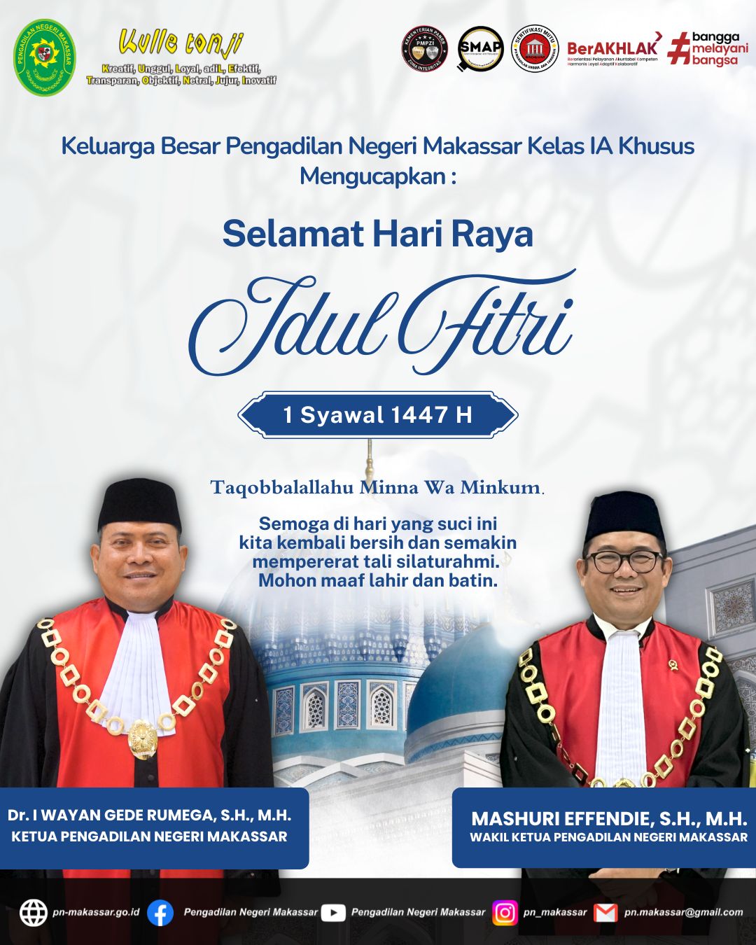 Sehubungan dengan Hari Libur Nasional dan Cuti Bersama dalam rangka memperingati Hari Raya Nyepi Tahun Baru Saka 1948 dan Hari Raya Idul Fitri 1447 H, Pelayanan Terpadu Satu Pintu (PTSP) PN Makassar Untuk Sementara Tutup, Mulai Tanggal 18 - 24 Maret 2026, Buka Kembali Pada Tanggal 25 Maret 2026, Atas Perhatiannya Terimakasih.